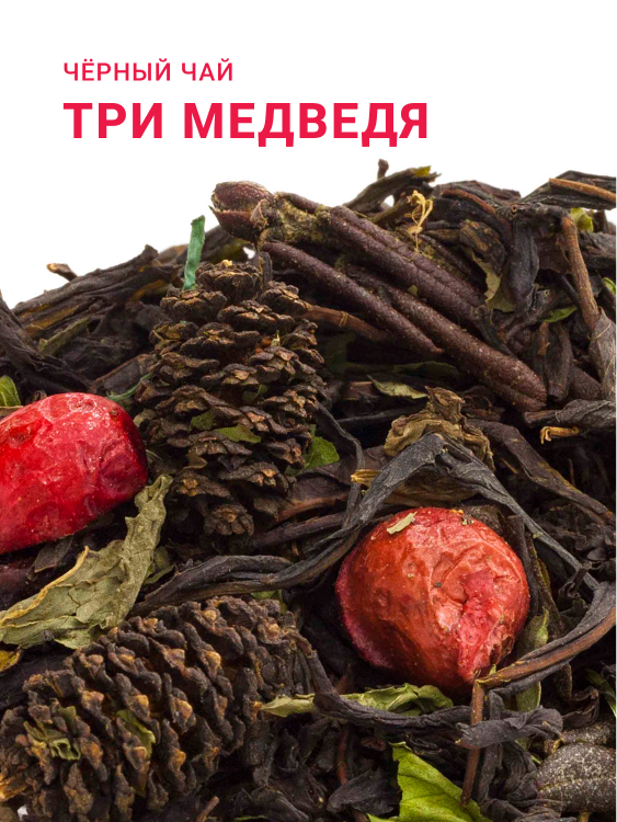 Состав: чёрный чай, клюква сушёная, иван-чай, мята марокканская, шишки, саган-дайля, слайсы клюквы, красная смородина ягоды, ароматизатор.